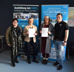 Foto: (v. l.) Petra Pascher (Koordinatorin, BKW), Helga Kockerols-Eßer (Persnalleitung, ene't GmbH), Gabriele Kaspers (Schulleiterin, BKW), Florian Turtschan (Mitglied Ausbilderteam, ene't GmbH)